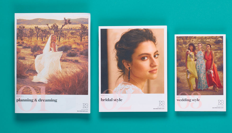 In Spring 2018, David’s Bridal introduced it’s new progressive print piece to replace the seasonal look books. Each piece of the kit is introduced to the bride when it is most pertinent to her during the different phases of her wedding journey. Bride Guide was designed systematically so that each piece scales proportionately to fit into the folder that houses the books. Type, photos, and layouts were also scaled consistently across all pieces. The piece is refreshed and redistributed quarterly.