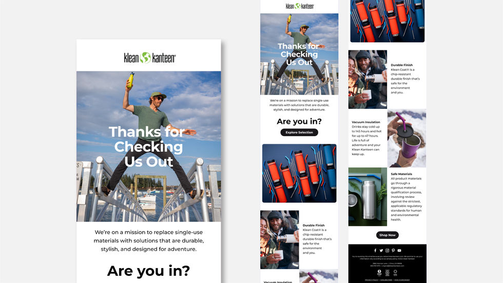 Kleen Kanteen’s targeted digital campaign included an on-site popup, a preference center, and email campaigns. The resulting design seamlessly integrates with the client’s existing email communications, maintaining brand consistency. The minimalist and modular design, primarily utilizes black and white with accents of the brand’s vibrant green color, allows for additional emphasis and visual interest on the products and hero imagery. The design is fully responsive, ensuring an optimized experience across desktop and mobile devices, as well as various email inbox platforms.